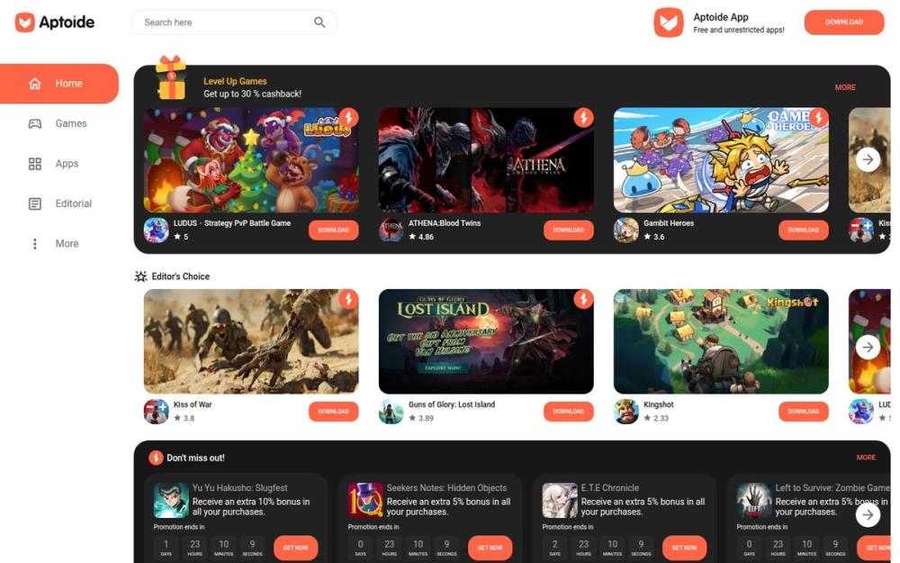 Aptoide 的优势在于多样化的获取渠道与灵活的促销工具:用户不仅能在主页面快速找到编辑推荐与热门游戏,还能通过奖励系统获得现金返利或购买加成。对于习惯在不同区域寻找特定版本或限时活动的玩家来说,Aptoide 提供了便捷的一站式入口。此外,编辑与专题内容为用户提供了更丰富的游戏背景与玩法介绍,帮助做出下载决策。