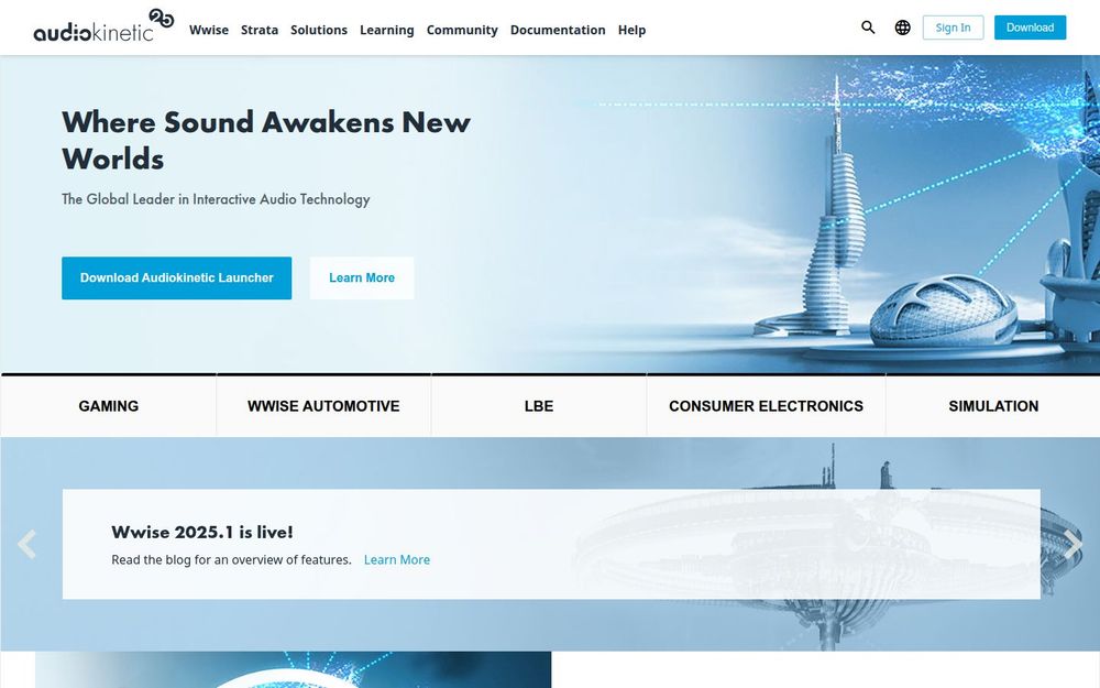 行业解决方案: 面向游戏、汽车(Wwise Automotive)、LBE、消费电子与仿真等场景,提供定制化的声音设计与集成方案。