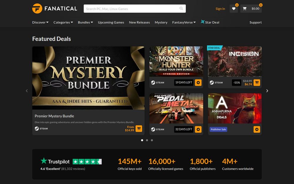 Fanatical 是一家面向全球玩家的数字游戏与电子书销售平台,主打官方授权激活码、多样化的游戏礼包和季节性促销活动。站点汇集了大量发行商与精品包,提供从独立游戏到大型3A作品的折扣和组合购买选项,页面也展示了平台的信誉指标(如 Trustpilot 评分)和关键数据(官方激活码销量、注册用户数等)。