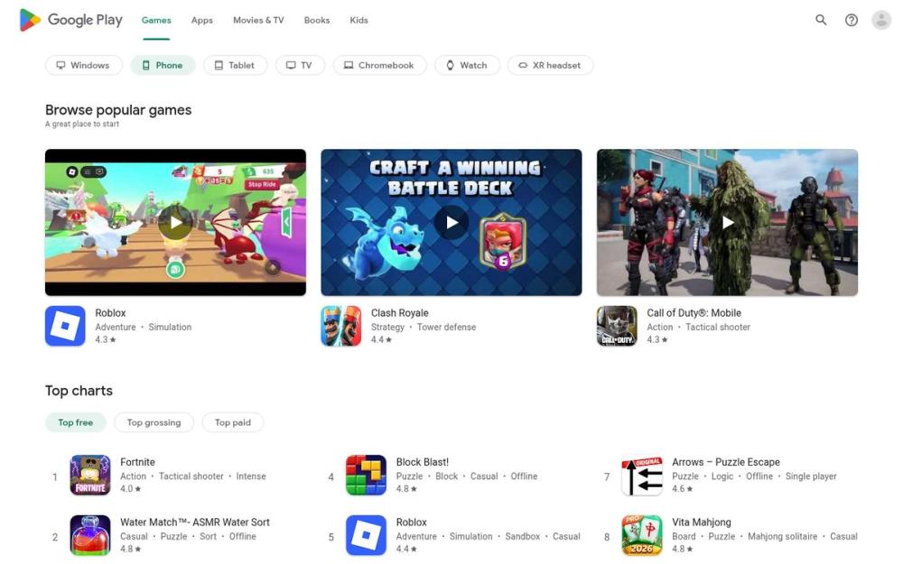 此页面为 Google Play(谷歌 Play) 的“游戏”分类入口页,面向希望发现、浏览和下载移动及跨设备游戏的用户。页面按设备类型(Phone、Tablet、TV、Chromebook、Watch、XR headset、Windows 等)提供过滤选项,并通过排行榜、推荐与活动卡片帮助用户快速找到热门与新颖的游戏。