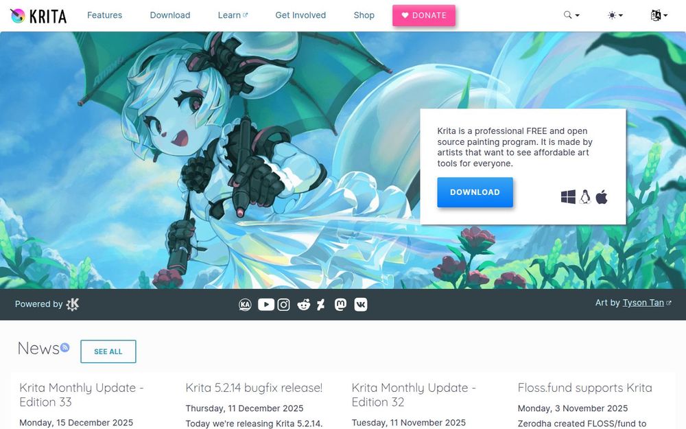 Krita 是一款由艺术家为艺术家打造的专业级免费开源绘画软件,目标是为所有创作者提供高质量且可负担的数字绘画工具。官网不仅提供软件下载入口,还汇集了功能介绍、资源库、社区论坛、艺术家访谈与开发动态,方便新手与资深用户了解软件能力与参与项目发展。