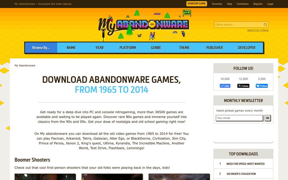 My Abandonware 是一个专注于旧电子游戏收藏与分发的网站,目标用户为怀旧玩家、历史研究者以及需要旧版游戏与资料的爱好者。站点收录的游戏时间跨度从1965年到2014年,档案量超过36500款,覆盖 DOS、Windows、Amiga、C64、街机等多种平台。网站提供免费下载、详尽的游戏信息页、截图预览与用户互动功能,旨在将经典与冷门游戏保存并传播给更多玩家。