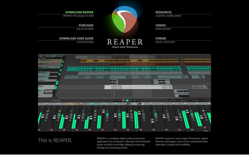 REAPER 是一款轻量但功能强大的数字音频工作站,面向专业录音棚、广播、现场录音、影视声音、游戏音频制作以及教育与研究等多种应用场景。它提供完整的多轨音频与 MIDI 录制、编辑、处理与混音工具,支持跨平台运行,并以高效、稳定与可定制性著称。REAPER 的许可模式价格亲民且无 DRM,提供长时间的免费评估期和持续的免费更新承诺。