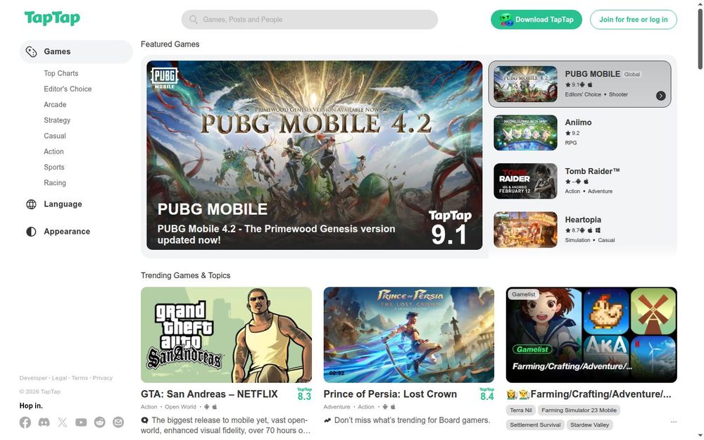 游戏发现与推荐: TapTap 提供 Top Charts(排行榜)、Editor's Choice(编辑精选)、以及按类型(如动作、策略、休闲等)细分的分类页,帮助用户快速定位热门与高评分游戏。